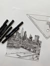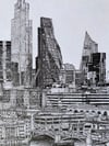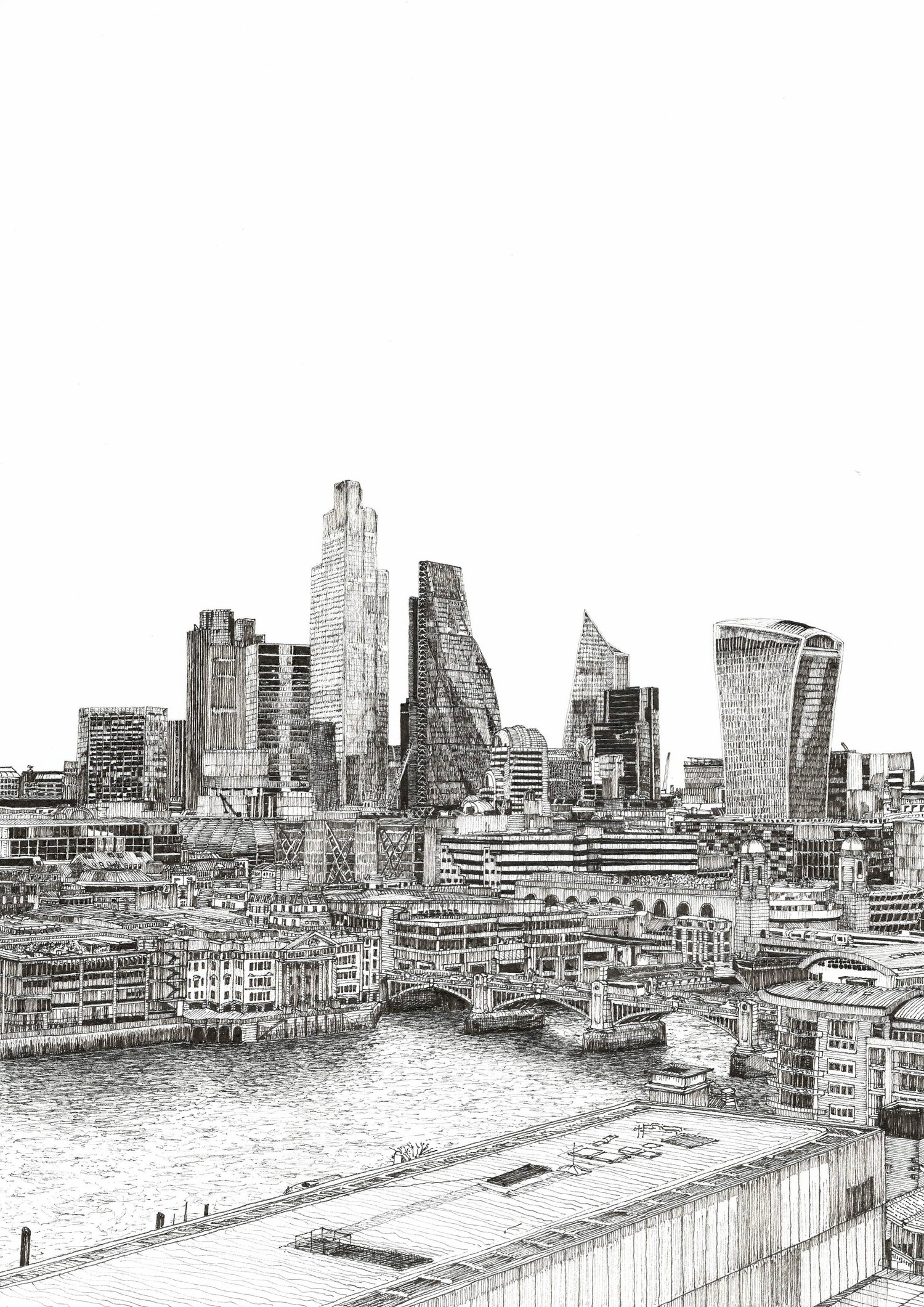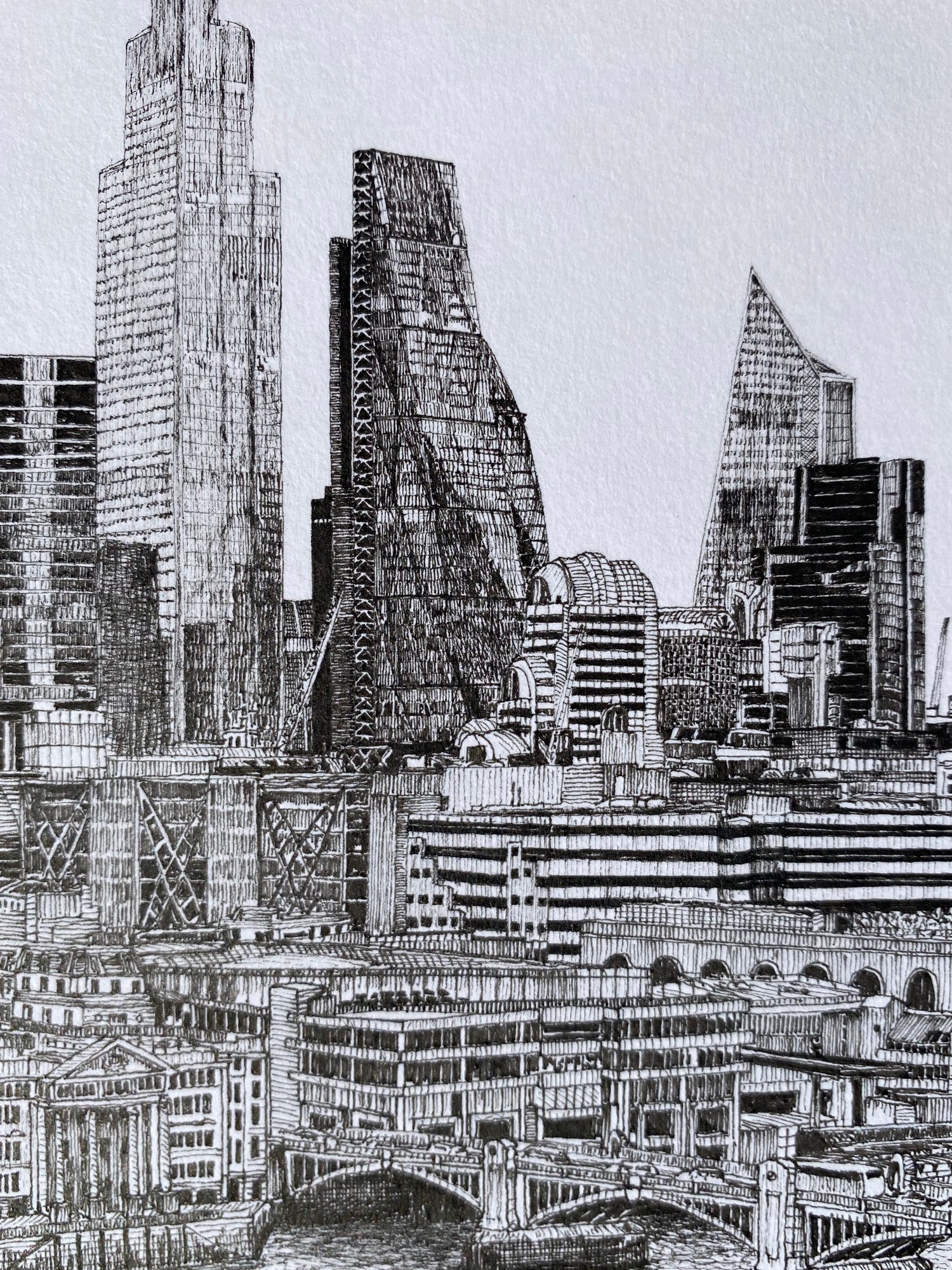 A fineliner illustration of the 2020 City of London skyline, featuring landmarks such as the Walkie Talkie, the Gherkin, and the Cheesegrater. Hand-drawn by artist, Josua Hattingh, available as a gallery-quality giclée print.