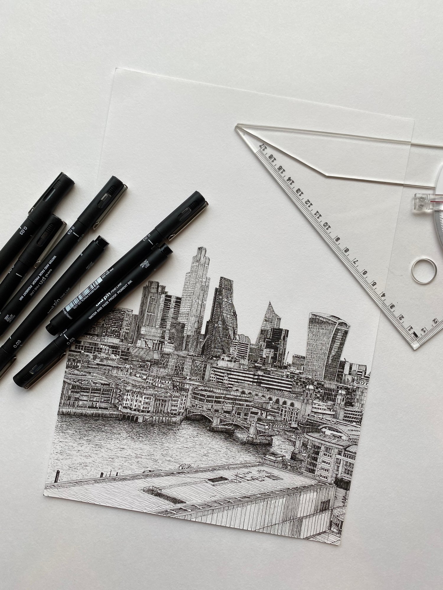 This piece began with a photograph taken from the Tate Modern in early 2020, just before the world slowed down. At 16 and freshly graduated from high school, Josua picked up fineliner pens and began experimenting. City of London Skyline became one of his first major drawings, capturing the energy and detail of the capital’s architecture.