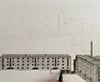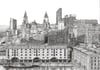 This drawing captures the heart of Liverpool, where the waterfront has long been a symbol of the city’s identity. From the Royal Liver Building and Port of Liverpool Building to the Albert Dock warehouses along the water, the composition brings together the architecture that defines the skyline.