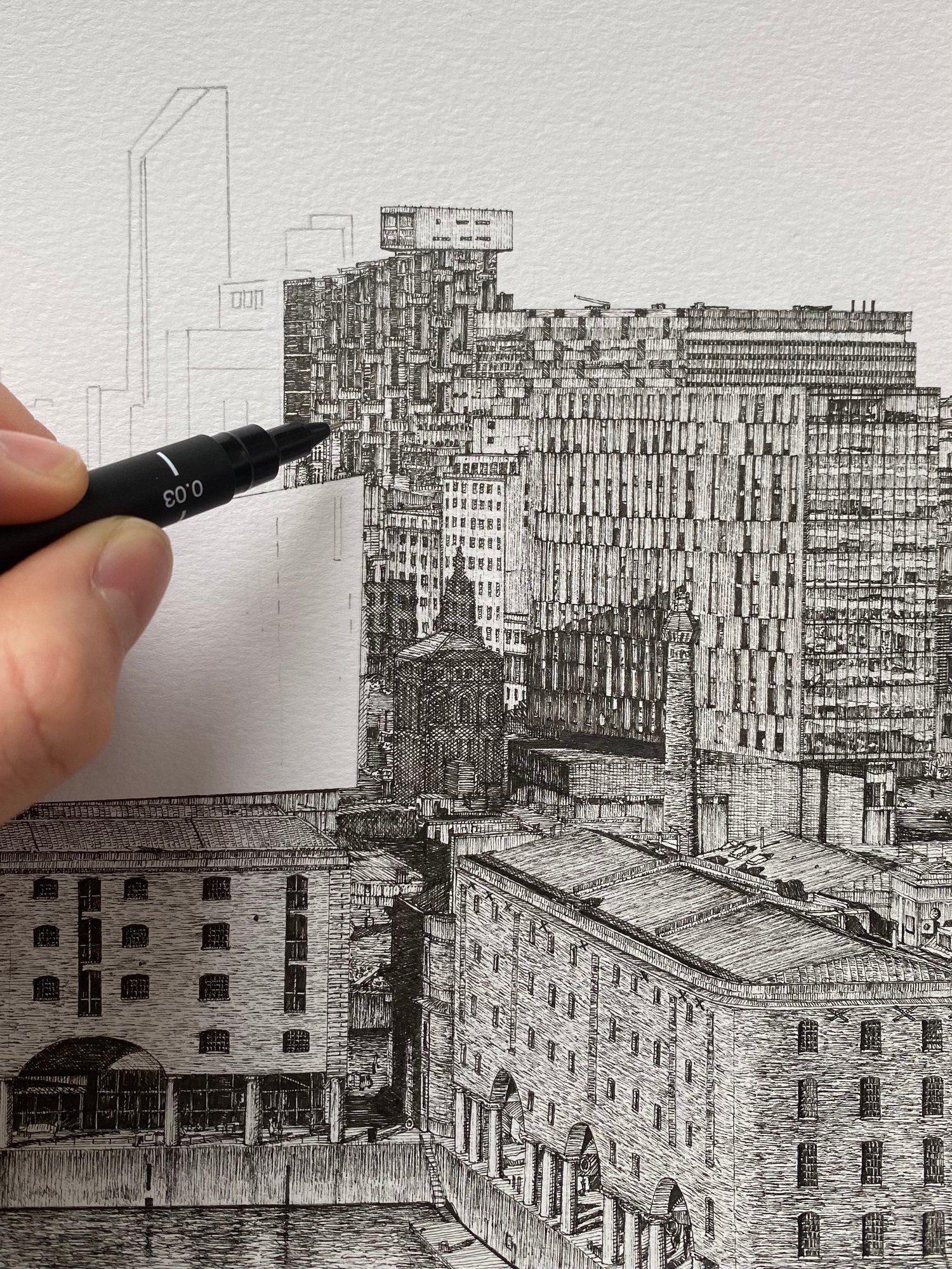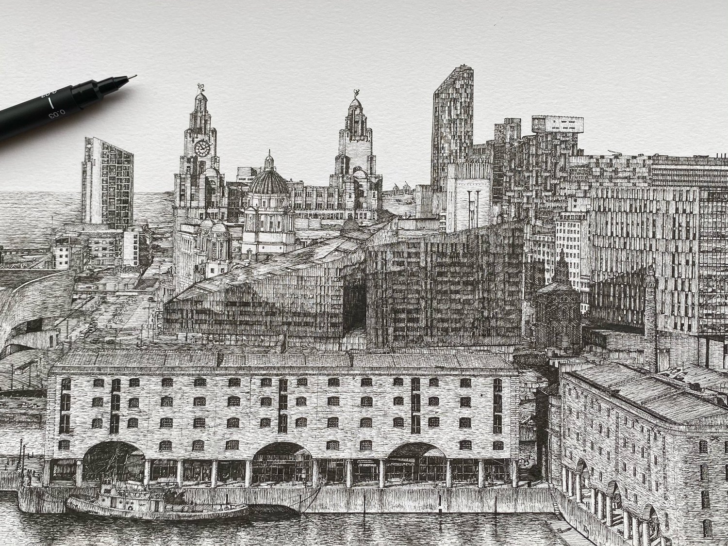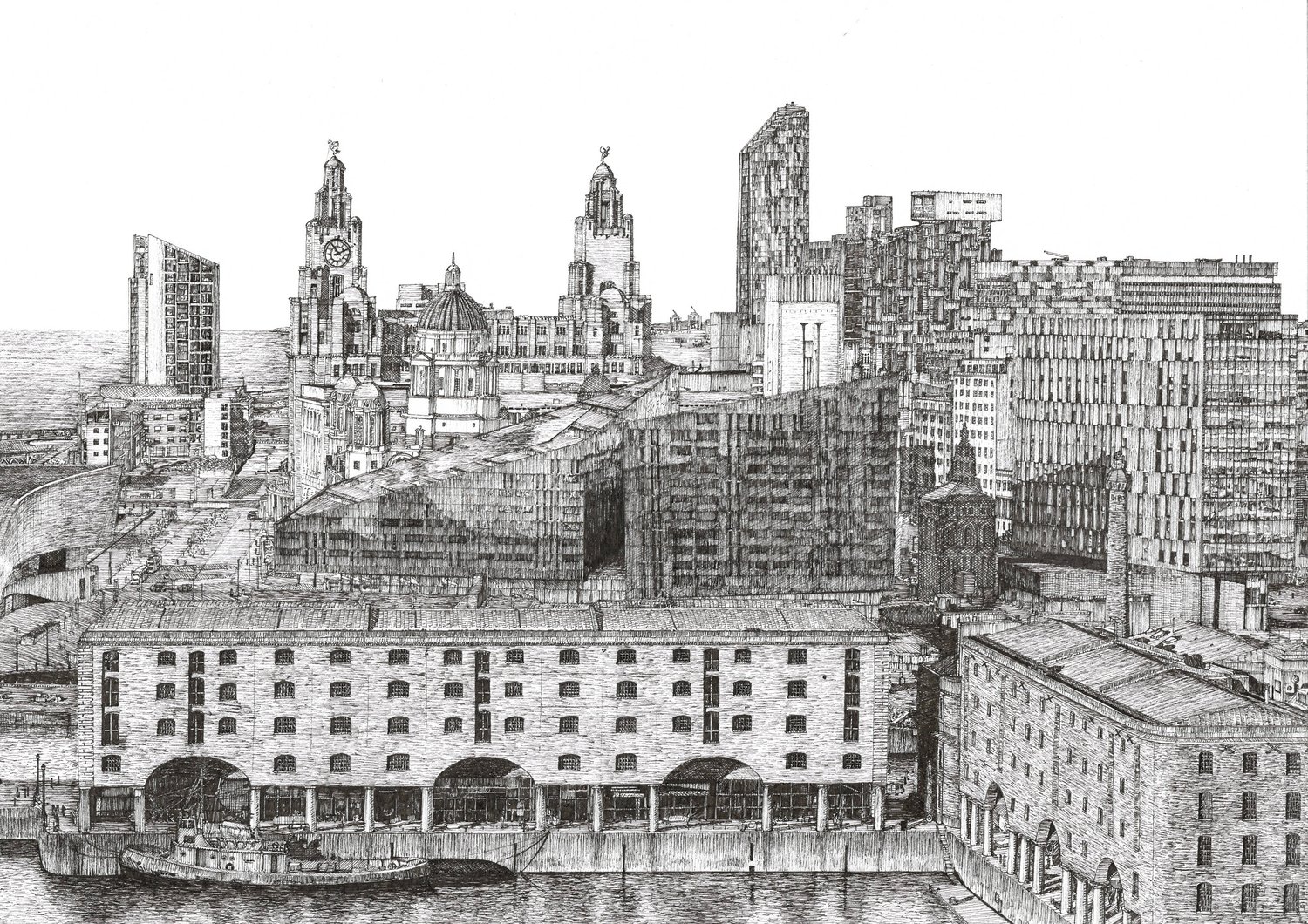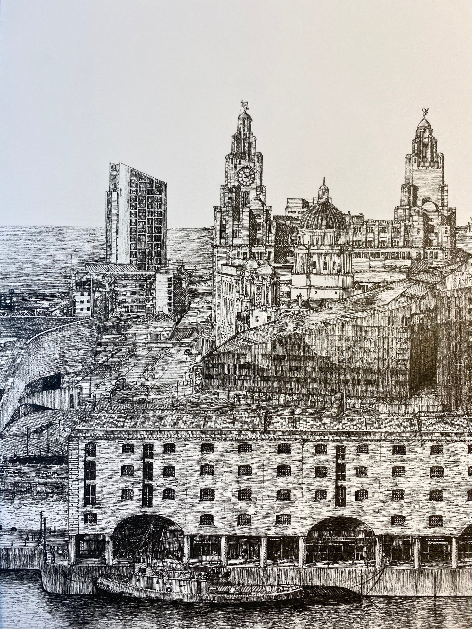 A fineliner illustration of Liverpool’s historic docks, framed by the city’s most iconic landmarks. Hand-drawn by artist, Josua Hattingh, available as a gallery-quality giclée print.