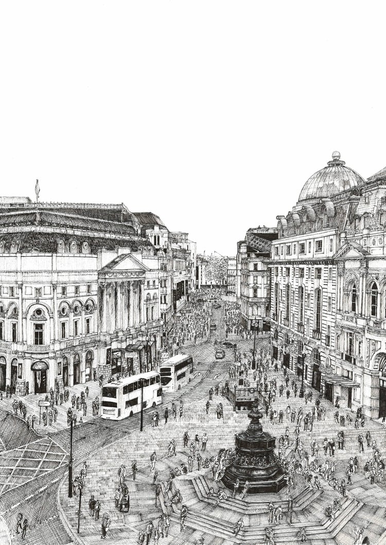 This drawing is part of Josua’s London series, and it captures the towering presence of Canary Wharf from above, a place that represents ambition, momentum, and opportunity. Iconic landmarks including One Canada Square, HSBC Tower, and the Citigroup Centre rise above the docks, symbols of London’s global financial power.