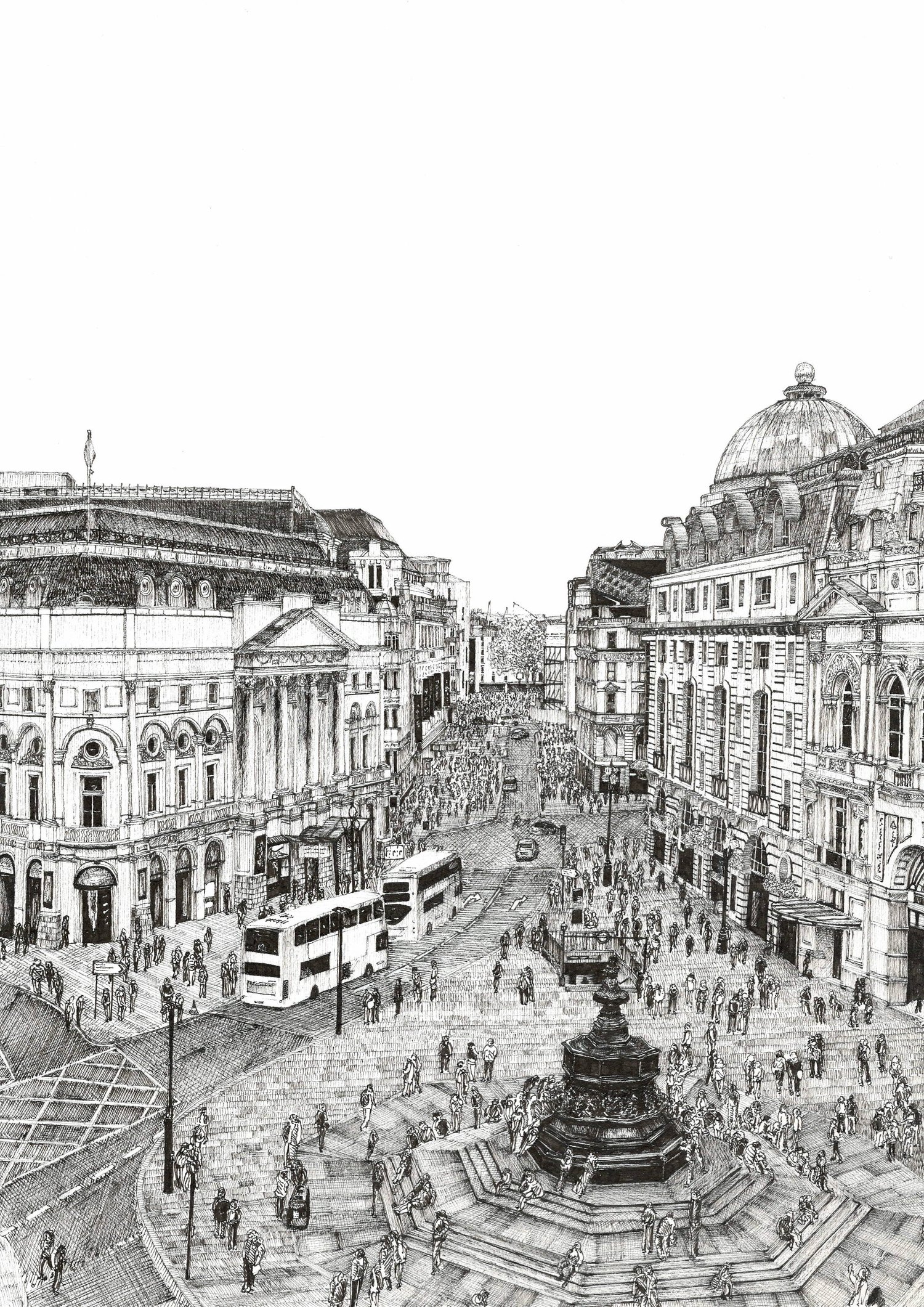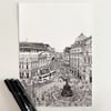 A fineliner illustration of Piccadilly Circus, capturing the energy of one of London’s most iconic intersections.