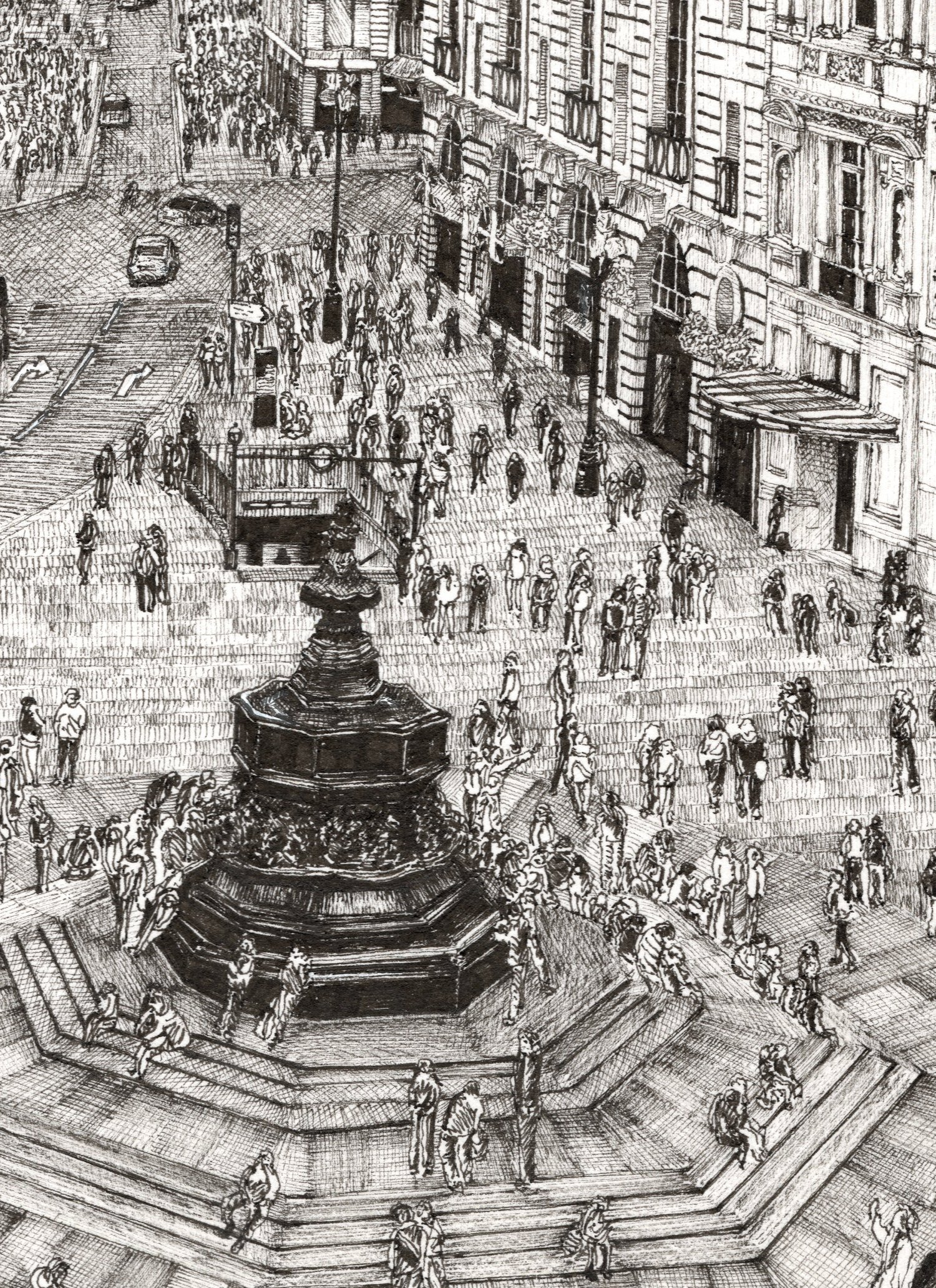 This drawing is part of Josua’s London series, created soon after his first experiments with fineliner art. While City of London celebrated the capital’s architecture, Piccadilly shifts the focus to the people who bring the city alive.